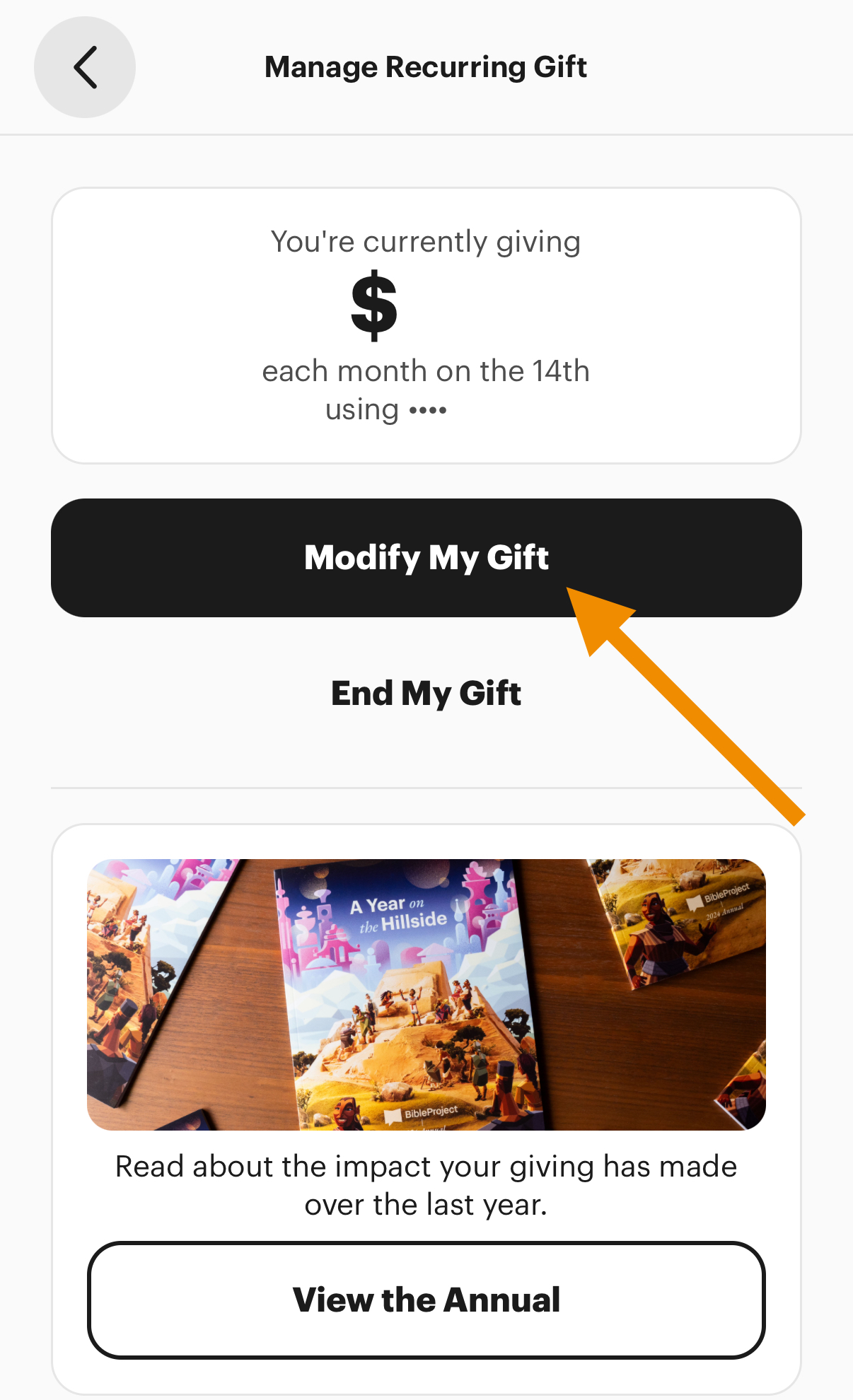You can update the billing date for your recurring monthly or annual gift from your BibleProject account, either on the website or the app.