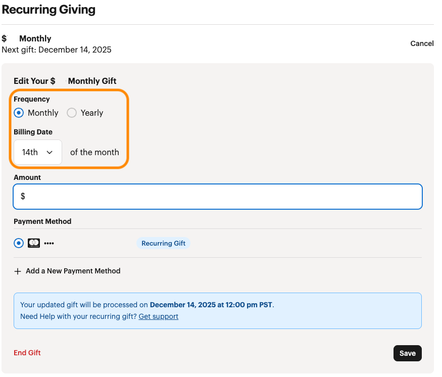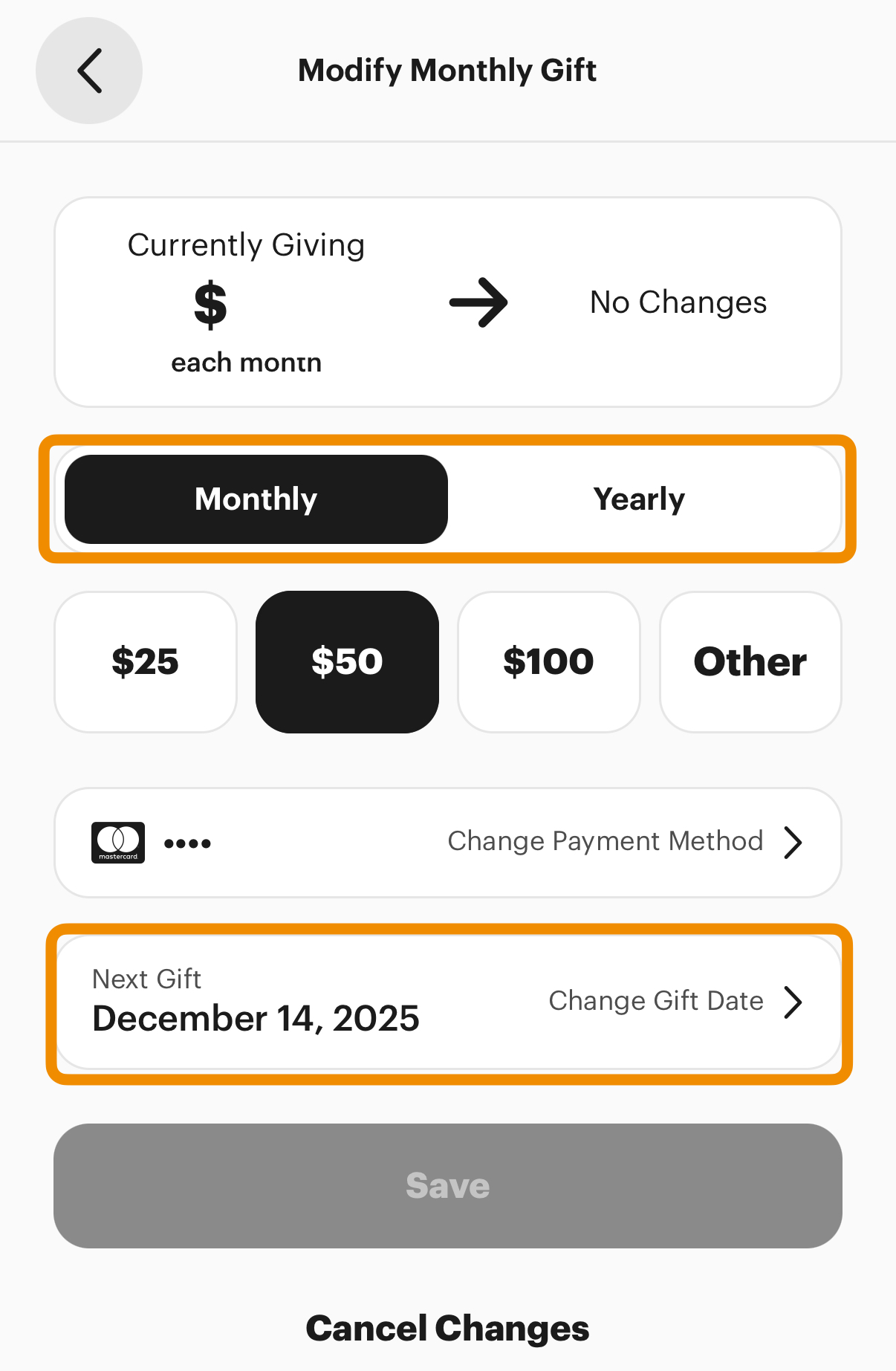- Update the frequency by selecting either Monthly or Yearly, or update the giving date by selecting Change Gift Date